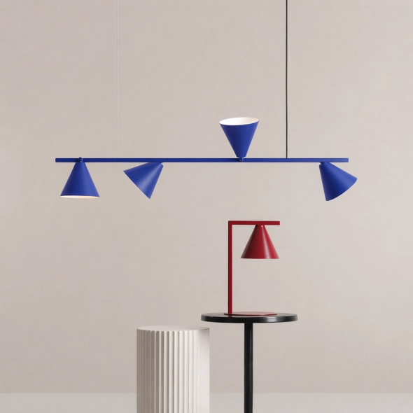 Form 4 Cobalt to designerska lampa sufitowa, która łączy minimalistyczną formę z praktycznymi rozwiązaniami. Cztery stożkowe klosze z możliwością indywidualnej regulacji pozwalają precyzyjnie skierować światło tam, gdzie go potrzebujesz — nad stół, blat czy wybraną strefę wnętrza.